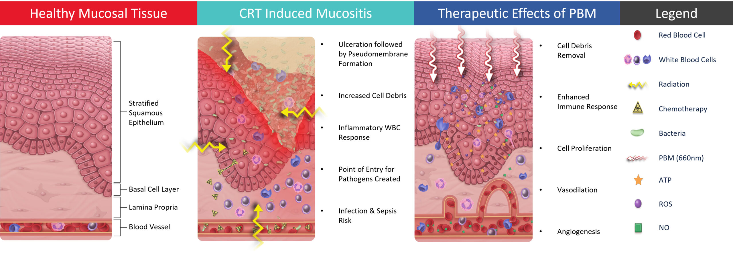 Photobiomodulation is the use of a specific dosage of light (wavelength, power and time) to stimulate biological functions, including wound healing. Photobiomodulation in the form of laser therapy has been demonstrated to be highly effective in the treatment of oral mucositis. However, this laser therapy must be operated by a trained clinician, can only treat small areas of tissue at a time, and one full treatment can take as long as 40 minutes, daily.